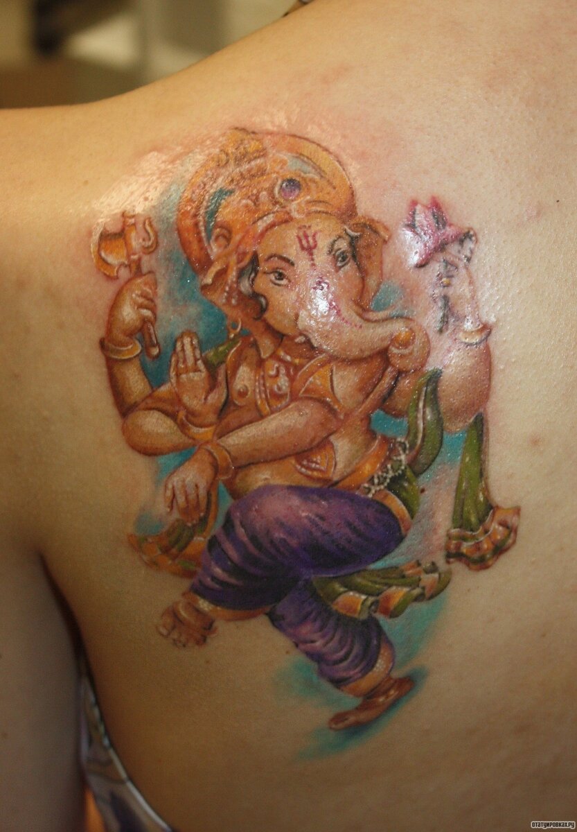 В индуизме предполагается существование бога Ганеши, которого нередко изображают в виде полного человека с одним бивнем и головой слона. Ганеша является традиционным богом мудрости, который широко известен среди всех творческих людей и помогает всем, кто к нему обращается. По легенде, данный бог был лишен головы вследствие гнева отца, а мать его взяла первую, попавшуюся под руку голову, которой была голова слоненка – и исцелила собственного сына. Татуировка слона, фото которой и представляет собой Ганеша, может традиционно обозначать, что владелец ее, уважающий восточную философию и индуизм, ищущий благополучия и мудрости, почитающий силу, которая активно направляет его по жизни.