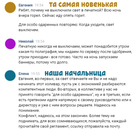Я работаю в творческом коллективе, у нас нет дресс-кода и четкого графика, молодой исполнительный директор, шутки, мемы и прочие вещи для нас норма, хотя и отвлекает от рабочего процесса. Для работы один чат, для флуда и тем "не для всех" - другой. В чат "не для всех" никогда не добавляли менеджеров среднего звена и юр.отдел, но недавно у нас появился менеджер проектов, ужасно нудная дама, которая всеми силами пыталась попасть в чат, а когда попала начала лезть к нам с правилами, что всех жутко бесит. Началось с конфликта за свет, который вроде как должен был закончится моментально, но нет Женя еще несколько дней возмущалась. Дальше лучше, мы никогда не собираемся на дни рождения, на тот момент Женя работала с нами месяц, но уже решила что мы все обязаны отмечать праздники, хотя никому это не нравится. Все желающие дарят подарок лично. Скандал продолжился и на следующий день! В итоге, Женю вызвали "на ковер" была долгая беседа, насколько мы знаем, а на следующий день она не пришла на