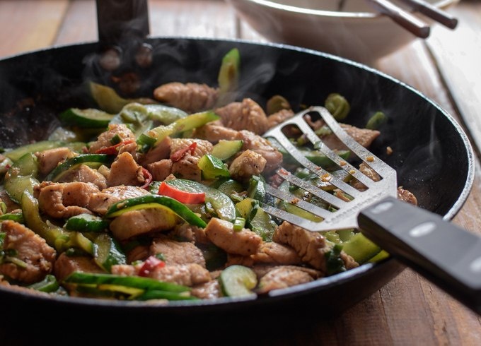 Понадобится -2 куриные грудки (нарезать на мелкие и тонкие кусочки) -1/2 чайной ложки соли -2 огурца (семечки удалить и тонко нарезать) 2 перчика чили (мелко нарезанного) -1-1/2 столовых ложки оливкового или подсолнечного масла -2 столовые ложки корейского соевого соуса для супа -1-1/2 столовых ложки соевого соуса -1 столовая ложка кунжутного масла -2 чайные ложки сахара -2 зубчика чеснока (мелко нарезать) -черный перец -20 гр. мелко нарезанного зеленого лука Способ приготовления: 1. Разрежьте огурцы пополам и удалите семена при помощи ложки и тонко нарежьте. 2. Посыпьте небольшим количеством соли и хорошо перемешайте. Дайте им настояться в течении 10 минут, пока из них не выйдет вся лишняя влага и они не станут мягкими. 3. Мелко нарежьте красный перец, перец чили, зеленый лук и чеснок. Если вы не любите слишком острые блюда, то можете не добавлять перец чили. 4. Возьмите глубокую миску и положите в нее нарезанную курицу, чеснок, соевый соус, перец чили, кунжутное м