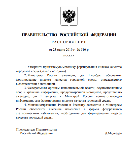 Минстрой выкатил исследование, охватывающее все города России, и по его результатам всем присвоил "индекс качества городской среды". За основу в исследовании были взяты 6 критериев, характеризующих 6 типов городских пространств. Были выделены следующие виды городских пространств: Критерии, по которым оценивались указанные пространства: По каждому из этих критериев город мог получить от 1 до 10 баллов. Итого максимальное количество баллов: 360. 3. Городская среда характеризуется совокупностью природных, архитектурно-планировочных, экологических и других факторов, формирующих среду жизнедеятельности города на определенной территории и определяющих комфортность проживания на этой территории. 4. Индекс города представляет собой цифровое значение (в баллах) состояния городской среды, полученное в результате комплексной оценки количественных и поддающихся измерению индикаторов, характеризующих уровень комфорта проживания на соответствующей территории (далее - индикаторы). Естественно, что