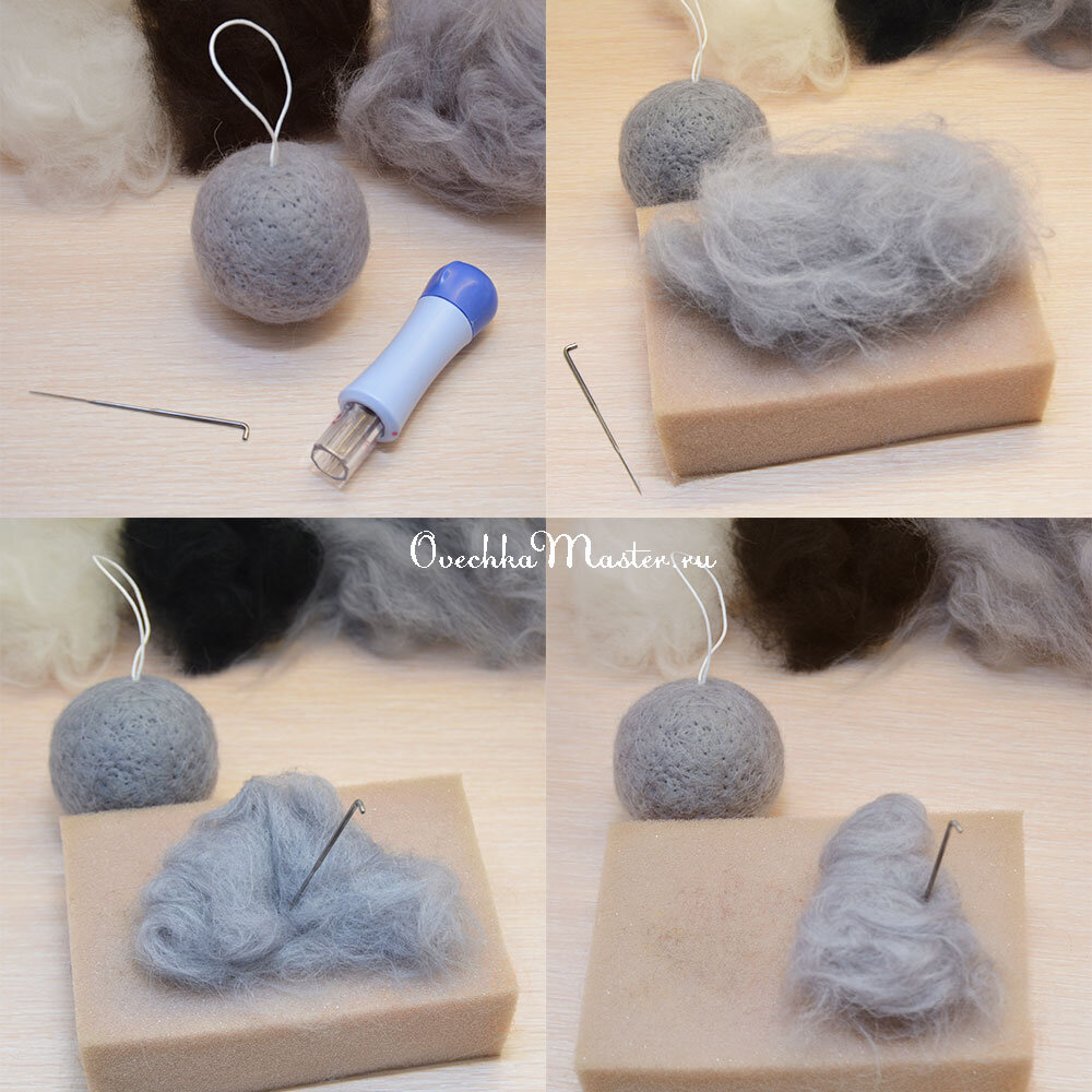 Всем добрый день. В прошлом году я валяла Свиношарики, а вчера сделала первый Крысошарик. И хочу поделиться с вами этой идеей. Такие забавные ёлочные игрушки вызывают только положительные эмоции. В прошлом году это был просто хит! Я уже говорила о том, что в дальнейшем хочу сделать набор из 12 разных шариков, привязанных к гороскопу. Поэтому постепенно буду делать подобные мастер-классы, и ближайший будет на тему: как сделать шарик Свинью. Вдруг кто-нибудь тоже захочет сделать, повторить. Итак, первый этап (смотать шарик из шерстяной пряжи и покрыть его слоем шерсти) я пропустила. Так как во всех поделках он одинаковый, и я показывала это уже не раз (ссылки оставлю в конце). И начинаю сразу с уже подготовленного серого шарика. Как всегда в работе я использую основную иголочку № 38 "Звезда" (или треугольную № 40). Но еще понадобятся более толстая игла № 36 и устройство с 7 иголками. Сначала буду создавать нос! Беру большой кусочек серой шерсти и придаю ему форму треугольника. Сначал