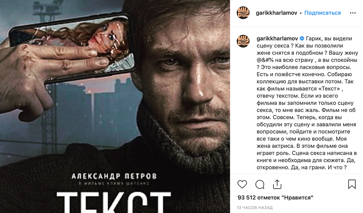Гарика Харламова 5 день травит общественность. "Куколд", "Роганосец" и прочие довольно неприятные комментарии про его жену Кристину Асмус. Если кто не знает, речь о бюджетном фильме "текст", по книге Глуховского, то ещё "произведение", кстати говоря. Бульдог оправдывается. Кино - место секса, это нормально. «Что думал муж Шерон Стоун в момент переноса ног на стуле? Как он ей позволил «совокупляться» весь фильм?» «Поздравляю режиссёра Клима Шипенко и весь актерский состав. Это очень круто! Все это я писал, как зритель!» Я не разобравшись тоже встал на защиту Харламова, а потом решил посмотреть сцены. И знаете, её там натурально сно+№ют. Без всяких там киношных уловок, в разных позах. Я немного зацензурил, но вы сами можете найти кадры в интернете, а есть ссылка и внутри Что особенно интересно, ей это нравится, не только в кино, но и в жизни, Асмус постоянно находится в ОАЭ. Тут же на семейную пару, обрушилась волна хэйта и негатива, люди стали делать "смешные пикчи" и скриншоты с