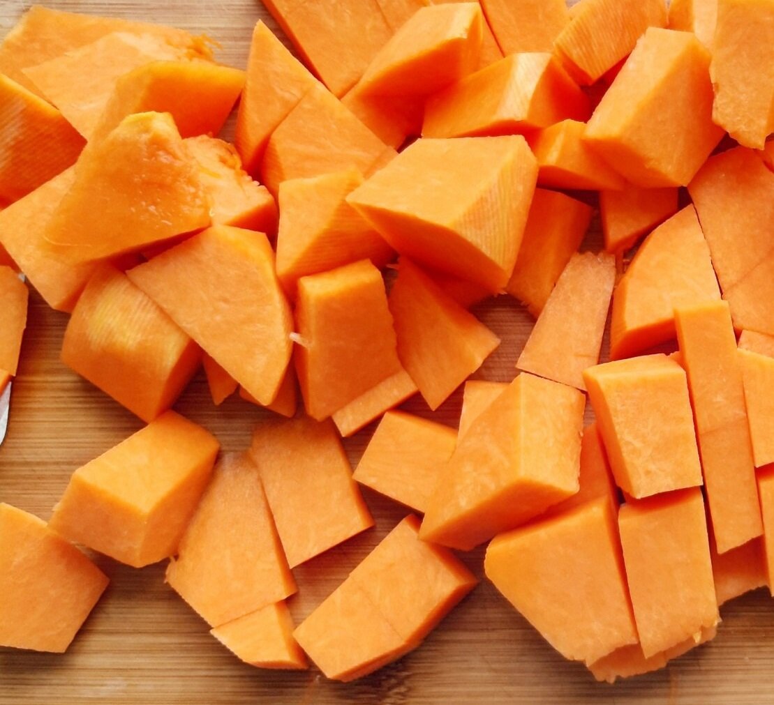 Для этого вкусного супчика нужны простые продукты. Самое приятное, что можно просто поставить варить все овощи и заниматься своими делами, пока они варятся. Через полчаса делаем из них пюре – целая кастрюля оранжевого удовольствия готова! Самое долгое в приготовлении супа – это очистка овоща – твердая кожура плохо снимается. Хорошо, если вы будете это делать острым ножом, но аккуратней – не пораньтесь) Что нам понадобится: Моем тыкву. Разрезаем пополам. Если она большая – берем половину, если маленькая, то понадобится вся. Разрезаем еще раз на четвертые части, вычищаем сердцевину с семенами. Делим на небольшие кусочки – так будет легче очистить. Снимаем ножом кожуру. Режем на кусочки примерно 2х2 см. Теперь подготовим другие овощи – картошку, лук и морковь чистим, режем на кусочки. Картошку можно просто порезать на 4 части, морковь и лук более мелкими кусочками, чтобы они успели провариться вместе в тыквой и картофелем. Чеснок очищаем и оставляем зубчики целыми. Кладем все в кастрюлю