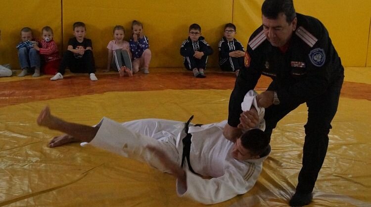 На открытии спортзала казачьей молодежи атаман Сергей Савотин положил на лопатки победителя первенства мира по самбо и дзюдо.В станице Раевской, пригороде Новороссийска, состоялось торжественное открытие спортивного зала казачьей молодежи для занятий самбо и дзюдо. Зал действует еще с августа этого года, но официальное его открытие казаки решили приурочить ко Дню народного единства. «Весной администрация Новороссийска передала нашему казачьему обществу заброшенный спортзал, – рассказал станичный атаман Игорь Бэдэнэу. – С помощью властей местного сельского округа и при содействии спортшколы «Водник» за лето мы привели зал в подобающий вид. А инициаторами и главными двигателями всего процесса стали наши казаки Анатолий Шкуратов и Александр Задорожний, а также тренер Максим Поряднев, казак соседней станицы Натухаевской, который занимается с казачатами и у себя дома, и у нас». На церемонии открытия собравшихся приветствовали атаман Черноморского казачьего округа Сергей Савотин, вице-прези