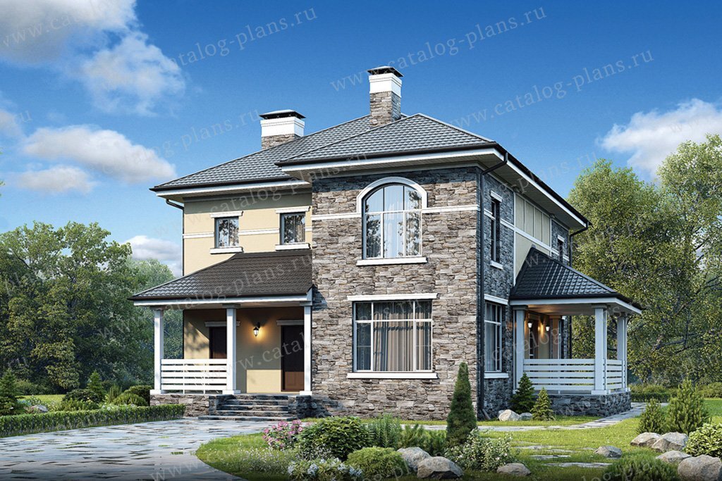 Проект двухэтажного дома из газобетона. Экстерьер дома отличается сочетанием различных по цвету и фактуре материалов. К ним относится камень, штукатурка, декоративные элементы, подчеркивающие границы и усиливающие контрасты. Несущие стены выполнены из газобетона и отделаны штукатуркой. В проекте предусмотрен монолитный железобетонный фундамент, перекрытия между первым и вторым этажом монолитные, чердачное перекрытие по деревянным балкам. Общая площадь дома 187 квадратных метров, габаритные размеры 13 х 10 метров. Такой дом может с легкостью разместиться почти на любом участке. Первый этаж разместил в себе все помещения гостевой группы. Здесь имеются гостиная с камином, кухня-столовая, гостевая комната, совмещенный санузел, котельная, прихожая с лестницей на второй этаж. Кухня столовая и гостиная могут быть в едином пространстве благодаря большой двупольной двери. Гостиная имеет выход на террасу. На втором этаже разместились три спальни, ванная, санузел, кладовая, большой просторный хо