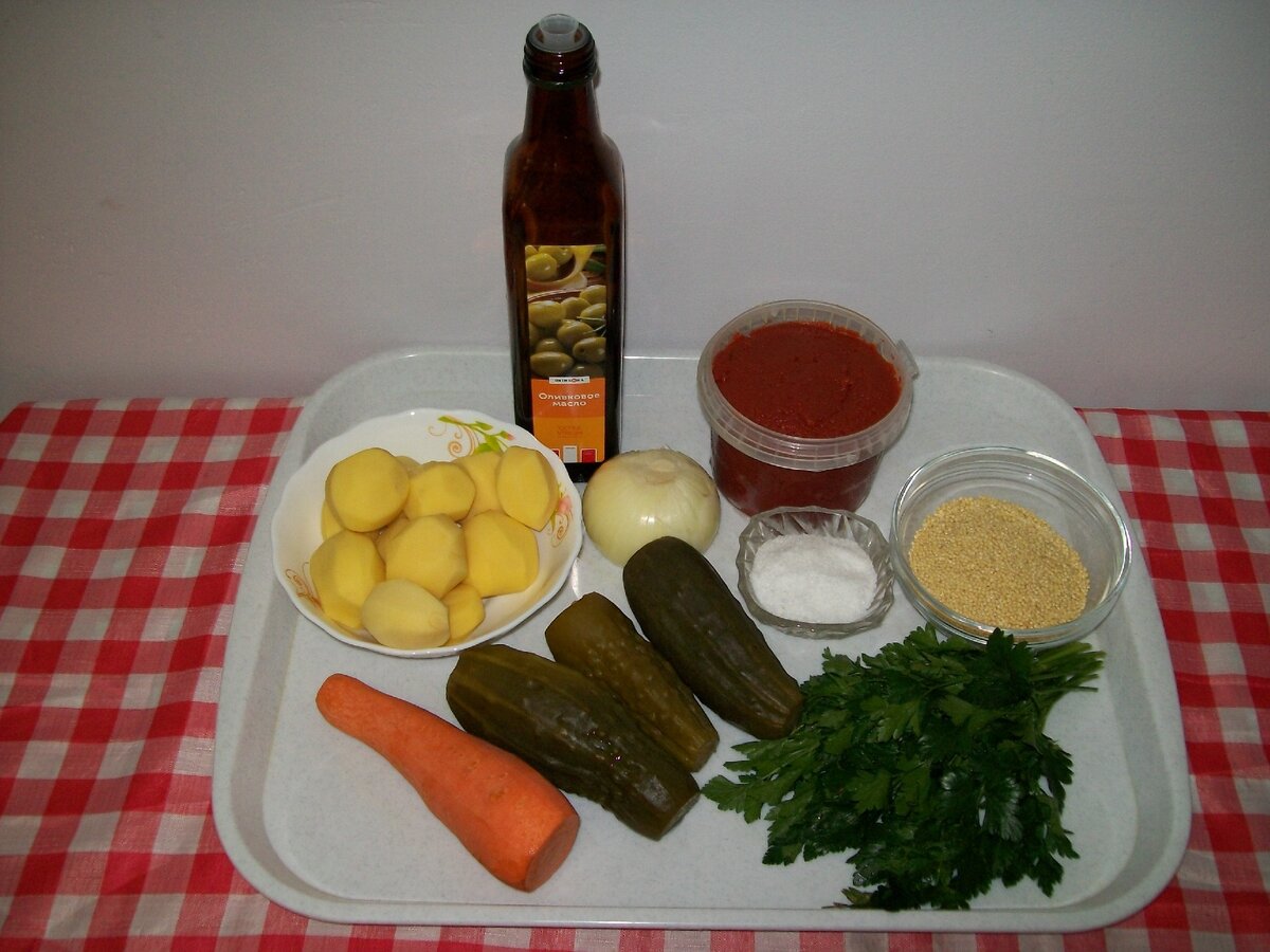 Все дело в том, что я просто не уважаю перловую крупу. Ну вот что-то не нравится она мне. А ведь рассольник принято готовить из перловой крупы. Вот раньше в школе нас кормили через день рассольником, который варили только с перловой крупой, запомнилось). Но я решила изменить чуточку рецептуру приготовления. Теперь варю частенько и получается очень даже вкусно). Давайте начнем готовить) Приготовила наваристый говяжий бульон. Картофель крошу кубиками. Половину головки лука мелко нарезаю и отправляю овощи в кастрюлю с бульоном. Пока картофель закипает, готовлю зажарку. В сковороду наливаю оливковое масло (можно растительное рафинированное), морковь натираю на крупной терке, лук мелко нарезаю и поджариваю на сковороде. Маринованные (можно соленые, даже кислые) огурцы тоже натираю на терке и добавляю к жареным овощам. Тушу примерно 5 минут на слабом огне. Затем кладу томатную пасту, хорошо перемешиваю и держу на слабеньком огне еще пару минут. Зажарка готова. Картофель почти сварился