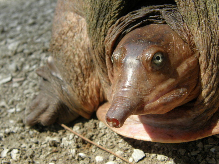 Знакомьтесь - гигантская мягкотелая черепаха. Самая крупная из всех пресноводных черепах и, к сожалению, самая редкая. Красивая, большая, с интересным серым окрасом, она привлекала внимание не только ученых, но и простых людей, которые употребляли ее и ее яйца в пищу. А также лже врачевателей из Азии, которые используют черепаху в своей "врачебной практике". Эта "малышка" питается рыбками, раками и моллюсками, хотя может полакомится и водными растениями. Обычно, она прячется в засаде, закопавшись в песок и вытащив лишь голову. Огромная, но резвая - атакует быстрее кобры! На сегодняшний день в мире осталось только 4 особи. Это очень мало! Но в китайском зоопарке живет парочка - самка и самец. Возможно, именно они станут продолжением популяции. Можно предположить, что этот вид черепах вымирает, потому что они такие большие, но вот черепашка Амбоинская шарнирная. Ее размер 20 см. Она тоже хищник. И она тоже занесена в красную книгу. Так что дело не в размере. Дело в нас, в людях!
