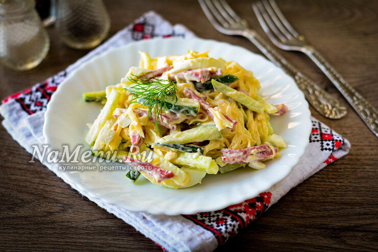 Салат "Соломка" с копченой колбасой и сыром, приготовит даже ребёнок