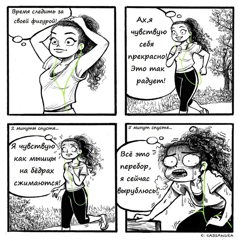 Каждый, кто старается следить за собой, ну, или, по крайней мере, пытается начать это делать, хоть раз задумывался о том, чтобы начать бегать по утрам. Решиться на такой шаг бывает не просто , поэтому первые попытки бегать зачастую полны различных неловких и курьезных ситуаций, о чем и поспешили рассказать художники со всего мира, комиксы которых я собрал для вас в этой подборке. Вряд ли кто-то станет спорить, что следить за своим здоровьем - это очень полезное и нужное занятие. И утренние (а может и вечерние) пробежки как раз отлично подойдут для всех, кто хочет заняться спортом и при этом не тратить кучу денег на абонементы в тренажерные залы. Но, каким бы прекрасным не казалось решение начать бегать по утрам, всегда нужно помнить, что переутомлять свой организм внезапными физическими нагрузками с первой же тренировки - это далеко не самая лучшая идея. И румынская художница Cassandra Calin, похоже, не по наслышке это знает. Решиться на пробежки - это, конечно же, важный шаг, но, даже
