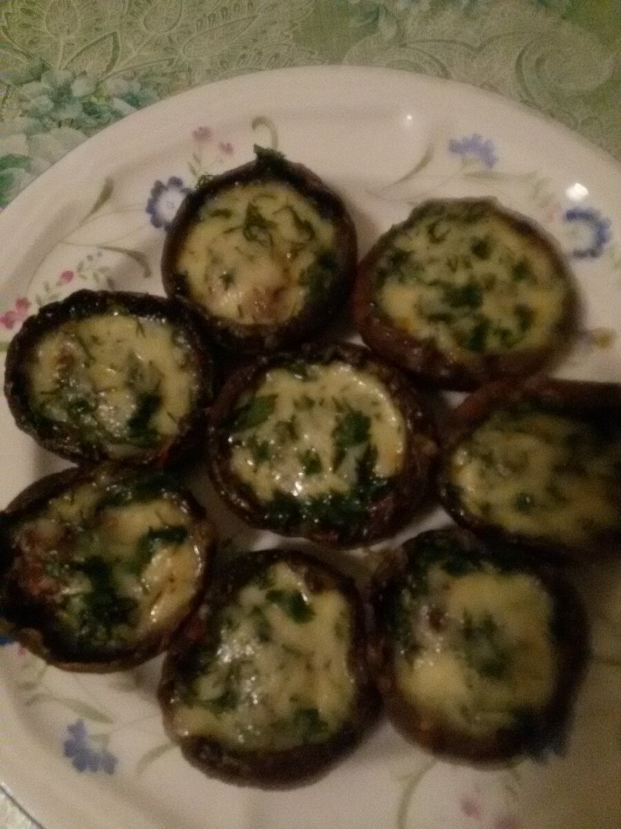 Всем привет ! И снова с вами я "леха-дегустатор". Для этой закуски вам понадобится : грибы шампиньоны , сыр , колбаса , петрушка , укроп , сливочное масло , растительное масло . Я не пишу какое количество необходимо для приготовления , так как каждый может брать разное количество на свое усмотрение . Ну а теперь готовим : Берем шампиньоны , удаляем ножки , далее я ложкой убрал внутри , что бы было больше места . В каждый грибочек я положил по маленькому кусочку сливочного масла . В каждый грибочек я положил по маленькому кусочку сливочного масла . В каждый грибочек я положил по маленькому кусочку сливочного масла . В каждый грибочек я положил по маленькому кусочку сливочного масла . В каждый грибочек я положил по маленькому кусочку сливочного масла . Далее сверху ложу тоненький кусочек колбасы . Ну а теперь все грибочки смазываем снаружи растительным маслом и отправляем в духовку или аэрогриль , кому как удобней , я запикал в аэрогриле . Температура 180 градусов и ставил на