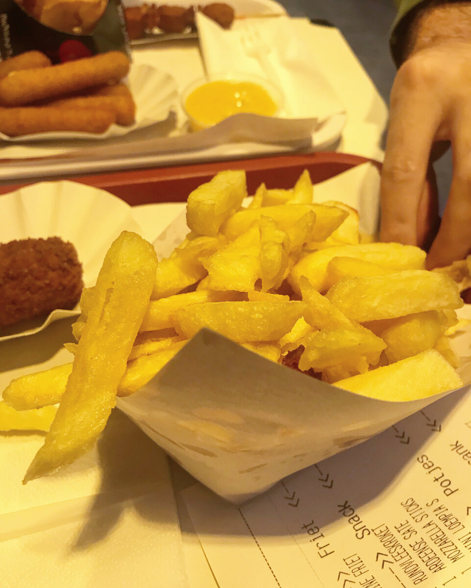 Это и правда хороший вопрос. С точки зрения напитков, это, как мы уже с вами выяснили, пиво. Пиво - это святое. Но что если к пиву добавить сочный, хрустящий, только что из кипящего масла...фритюр! Особенно картошечку фри, и чем больше - тем лучше. Наверняка многие из вас знают, что French fries вовсе не French, а Belgian. Да-да, всеми любимую картошечку фри придумали именно в Бельгии и ой как давно, пару-тройку сотен лет назад. Однако во время Первой Мировой бельгийская картошка превратилась во французскую, а все благодаря американским солдатам. Попробовав ее впервые у бельгийских солдатов-франкофонов, они окрестили её французской только из-за языка, на котором говорили их союзники. Эта оплошность стоила Бельгии своеобразной гастрономической дырки, ведь с тех пор все ассоциируют картошку фри с Францией. Но, помимо «фритчес» (картошечки фри собственно), в местных фритюрных можно найти и кучу всего другого. Всевозможные мясные закуски, такие как viandel (сосиска из фарша в панировке),