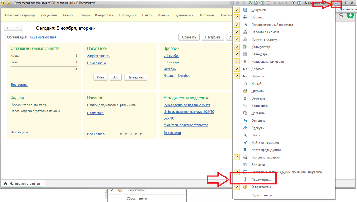 Сначала добавим кнопку параметры. Для этого, в правом верхнем углу есть маленькая стрелочка указывающая вниз, нажимаем ее и выпадет меню с доступными кнопками, те которые у нас включены отмечены галочками, те которые нет соответственно выключены. Включаем параметры. Включаем параметры. Затем нажимаем на иконку гаечного ключа, откроется окно с настройками параметров. Ставим галочку "Отображать панель Все функции". Панель Все функции стала доступна из основного меню