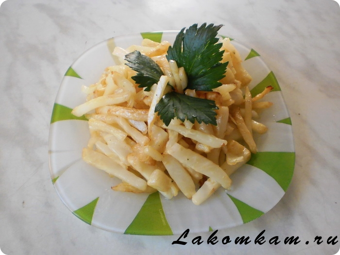 В сковороде разогреваем растительное масло и жарим сельдерей как обычный картофель, подсаливаем по вкусу.