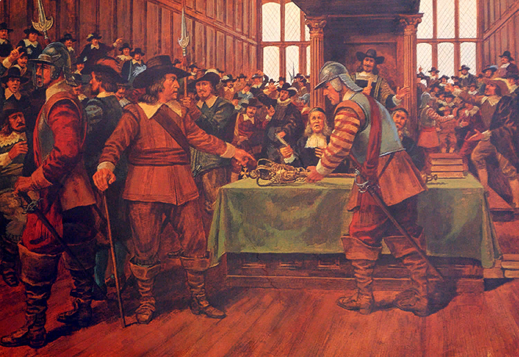 22 января 1655 года — Роспуск Кромвелем парламента Англии. Созванный несколько месяцев назад (в сентябре 1654 года), парламент вместо содействия ему, протектору, в проведении необходимых реформ, стал играть роль оппозиции, считая себя учредительным собранием в самом широком смысле этого слова. Вместо того, чтобы признавать власть протектора, он присваивал себе верховенство. Кромвель твердо доказывал палате, что раз она не признает его права, то и сама становится бесправной, а свое право он основывал, и совершенно справедливо, на своих победах, в которых видел проявление благодати Божией.