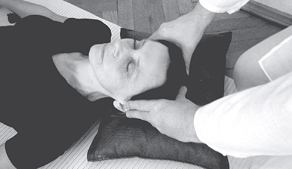 ШИАТСУ: ГОЛОВНАЯ БОЛЬ ЛЮБОГО ПРОИСХОЖДЕНИЯ Головную боль, вызванную неопределенной причиной, можно снимать при помощи нескольких эффективных приемов поскольку эти приемы не только снимают болевой синдром, но и комплексно воздействуют на организм, устраняя целый ряд возможных причин головной боли. 1. Укладываем пациента на спину и садимся у его изголовья. 2. Надавливаем в течение 5 секунд на каждую из шести точек заднесрединного меридиана, проходящего через макушку (фото 2). Сделайте 3 прохода по указанным на рисунке точкам. 3. Затем воздействуем по 5 секунд на 3 основные (для этого приема шиацу) точки слева и справа от центра макушки. Всего выполним четыре прохода по указанным точкам. 4. Повторите надавливание на точки заднесрединного меридиана, стараясь двумя ладонями накрыть голову и задействовать все точки одновременно (в течение 5 секунд). Всего сделайте четыре цикла надавливаний. 5. Теперь одновременно надавливаем на 3 основные точки слева и справа от центра макушки