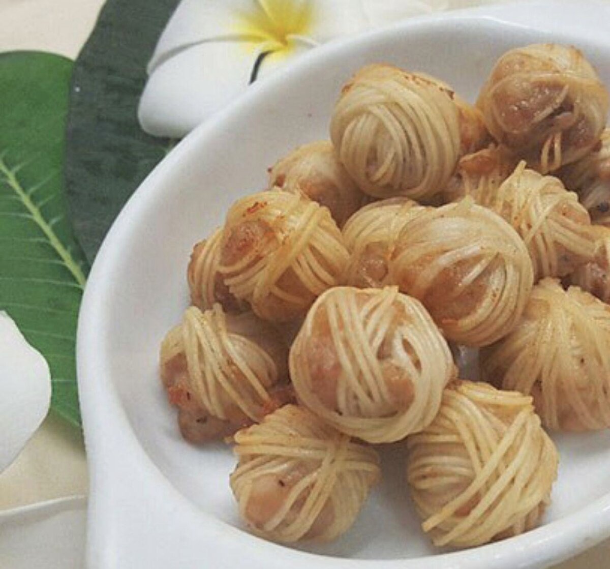 Кхун Муен - это традиционная тайская еда, которую готовят из рубленой свинины, приправы (чеснок, перец и корень кориандра), небольшого количества кукурузного крахмала, формируя шарики, обмотанные рисовой лапшой. Ингредиенты: • мелко рубленная свинина или курица (можно использовать фарш из курицы); • чеснок, перец, корень кориандра, растертые вместе - 1 столовая ложка; • 1 столовая ложка кукурузного крахмала; • 1 чайная ложка соевого соуса; • рисовая лапша ; • растительное масло (для жарки); Формируем фарш из мяса, кукурузной муки и соевого соуса. Формируем небольшие шарики из фарша и оставляем их на 20 минут в морозильной камере, в это время отвариваем рисовую лапшу. Достаем мясные шарики, и "обвязываем" их лапшой достаточно плотно. Обжариваем шарики в разогретом масле на средней температуре, жарьте до золотой, хрустящей корочки. Подавать с соусом чили или соевым соусом. Блюдо готово! Приятного аппетита! ทานเล่น!😋 Другие наши рецепты: Хотите ещ