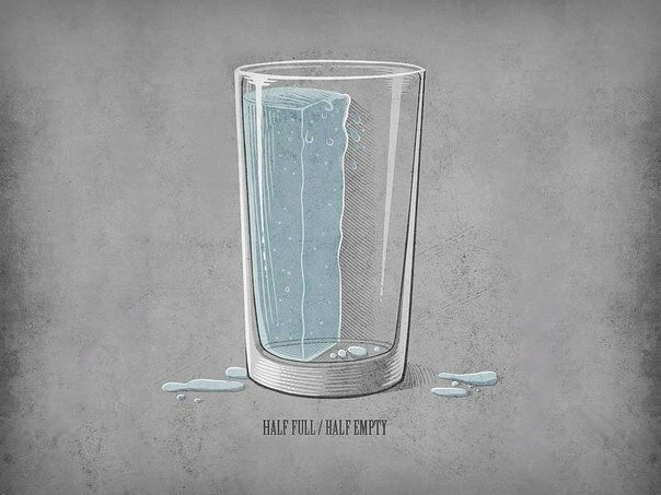 1. Буддизм: стакана на самом деле нет. 2. Солипсизм: стакан есть только у меня. А весь мир — мой алкогольный бред. 3. Ислам: нет стакана кроме стакана. 4. Иудаизм: ну почему стакан наполовину пуст только у нас? 5. Православие: стакан наполовину пуст за грехи наши. 6. Католицизм: стакан наполовину пуст только у плохих людей. 7. Фрейдизм: в детстве вам недоливали. 8. Стоицизм: да. Стакан наполовину пуст, и так мне и надо. 9. Коммунизм: каждый имеет право на полный стакан. 10. Социализм: стакан пустой. Зато у всех одинаково. 11. Йоги: ты и есть стакан и его содержимое. 12. Пелевин: стакан не пуст и не полон. Это и не стакан вовсе. И это не ты на него смотришь, а стакан смотрит на твою проекцию его мыслей о том, чем ты хочешь казаться самому себе. Или нет.