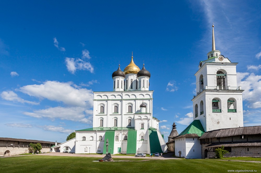 Во Пскове граде есть кремль. А в нем - Вечевая площадь. Площадь эта была когда-то местом сбора Народного Вече, которое изначально было органом местного самоуправления , а позднее стало высшим государственным органом. Но не о площади хочу вам сегодня рассказать, а о храме, что располагается в центре кремля, и непосредственной близости от площади. Речь сегодня пойдет о Троицком храме. Храм сей считается главным собором Пскова и с ним связана легенда одна. Говорят, на речке Великой было княгине Ольге (жене князя Игоря и основательнице Пскова) видение. Увидела она однажды 3 Луча Пресветлых, сходящих с неба и сказала тогда своим спутницам :" Да будет вам ведомо, что изволением Божиим на этом месте будет церковь во имя Пресвятой и Животворящей Троицы и будет здесь великий и славный град, изобилующим всем". На этом месте она воздвигла Крест и основан Троицкий храм. Рассмотрим храм поближе В собор мы еще вернемся, а пока... смотрите какая красивая и ухоженная территория кремля пс