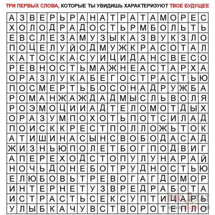 Среди букв найдите три слова те, что первым бросились в глаза. Они охарактеризуют ваше ближайшее будущее. В комментариях напишите что у вас получилось. У меня лично: разлука, бег, страсть. Неплохо, ДА? Читайте также: Вот что может рассказать о характере большой палец на руке! Читайте также: 4 вида поп, какая из них Ваша?