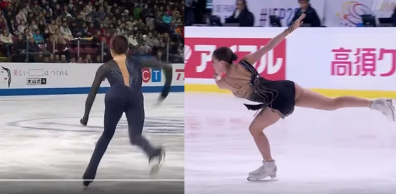 Предлагаю сравнить ребро на лутце у Евгении Медведевой на этапе гран-при в Канаде и Алины Загитовой во Франции. В короткой программе в Канаде судьи поставили Евгении неясное ребро на лутце. На долю секунды Евгения попыталась сделать ребро ближе к внешнему, но в целом видно, что ребро при самом отрыве чётко внутреннее. А вот в произвольной те же технически контролёры поставили уже неверное ребро, хотя техника исполнения была точно такой же. Что называется найди десять отличий... А теперь смотрим на лутц Алины Загитовой. Напомню, что в короткой программе Алине поставили неправильное ребро. В короткой программе оператор выбрал неудачный ракурс для съёмки лутца, поэтому придётся воспользоваться любительской съёмкой с трибун. С того ракурса, который был в трансляции, мне показалось, что ребро у Алины было максимум неясным, но уж точно не внутренним. А вот на этих кадрах видно, что ребро на отрыве правильное. В произвольной тоже проблема с ракурсом съёмки. Но даже на любительской записи