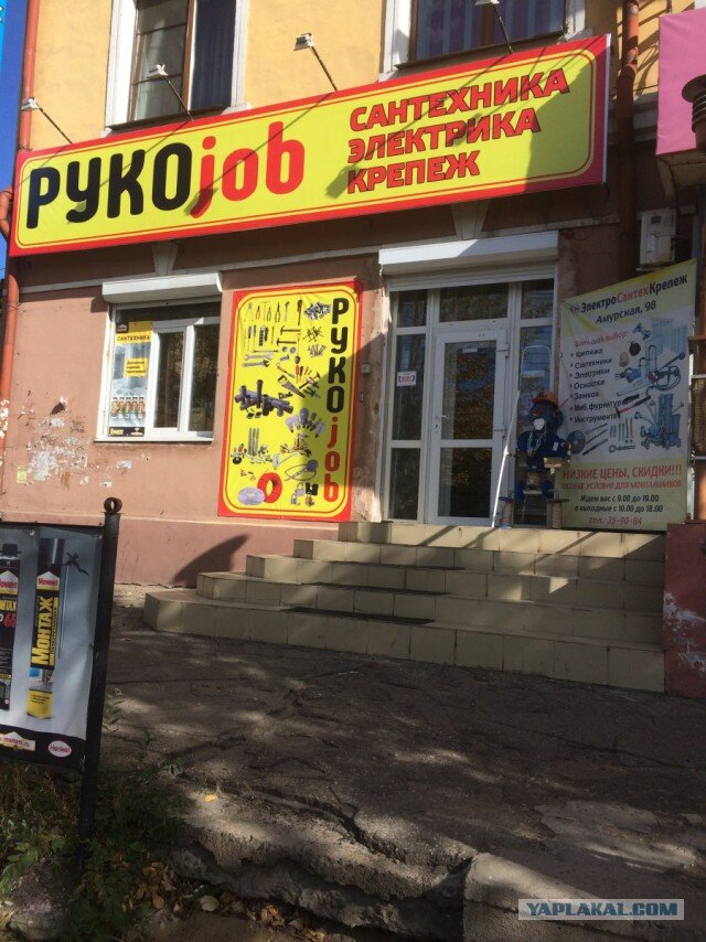 Я вас приветствую, уважаемый читатель, на своем канале! Сегодня среда, а значит уже половина трудовой недели позади. Хватит работать сделайте небольшой перерыв. Сходите налейте себе чашечку ароматного кофе, а вместо сигареты (курение вредит вашему здоровью!), почитайте эту статью. Поднимите себе настроение! Ведь улыбка продлевает жизнь. А когда начальство видит улыбающегося работника, тоже немного добреет! Все знают, что "реклама двигатель торговли". И правильно подобранные заголовок и текст, могут существенно поднять продажи. Хорошие рекламщики на вес золота, и стоят приличных денег. Но не у всех есть возможность выделить значительную часть бюджета. Вот народ и старается самостоятельно скреативить. В нашей современности очень часто встречаются коверканье слов, фраз и даже сращивание из разных языков. Вот мне интересно что имел ввиду хозяин этого магазина? Job - по английски значит работа. РукаРабота, может рабочая рука, тогда как-то двусмысленно получается. Я бы такого мастера к себ