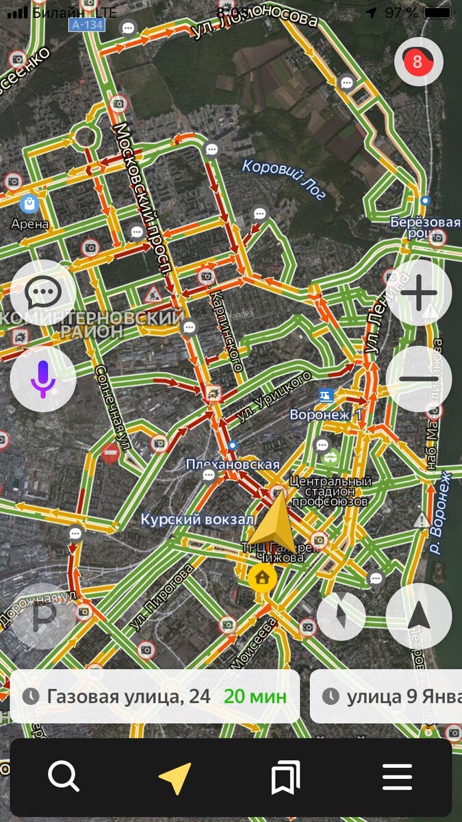 Перекрытие виадука привело к страшным пробкам! Пробки случаются каждый день но такого ещё не было! Улицы Плехановская и Кольцовская совсем не движутся. А на Донбасской скорость не превышает 5 км/ч. - "Напомним, виадук на ул. 9 Января давно требовал ремонта. Движение по нему запретили для пешеходов из-за огромных сквозных дыр в покрытии. Восстанавливать асфальт приходилось несколько раз в год. Сроки ремонта — до 1 октября 2020 года. Власти пока не могут сказать, на какой именно период закрыто движение. Ранее мэр Воронежа заявлял, что строители постараются уложиться в 4 месяца." - сообщает МОЁ ОНЛАЙН. Друзья, выбирайте дорогу по карте, на которой меньше заторов. Иначе придется потерять около 2 часов. Желаю удачи и меньше пробок. Ну а мы будем надеяться на скорейшее разрешение проблем!