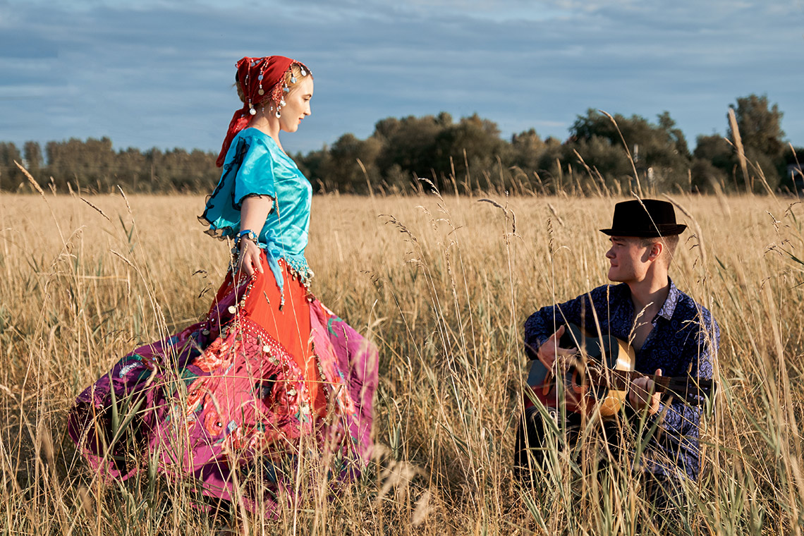 Цыгане, или рома, известны всему миру. Считается, что свой кочевой путь их далёкие предки начали в Индии, а со временем сформировался особый народ с общими корнями, языком и тщательно охраняемыми традициями. К последним относится и цыганский костюм, отражающий их эмоциональность, образ жизни и предпочтения. Что же носят загадочные Эсмеральды и пылкие Алеко? Как сформировался костюм Эталон женского цыганского костюма – длинная пышная юбка с воланами, пёстрая блуза с широкими рукавами и килограммами украшений – окончательно сформировался в Румынии в конце XIX века, когда гордый народ получил в этой стране свободу. Кочевники отправились колесить по Европе, и приходившим на их уличные выступления зрителям пришлись по вкусу яркие одеяния. Фасоны подхватили и остальные цыгане. До этого осевшие в России рома ходили в тюрбанах, простых платьях и кутались в длинные шали. Финские цыганки шили чёрно-серые наряды из тяжёлых плотных тканей – например, бархата. В Англии темноволосые красавицы носи