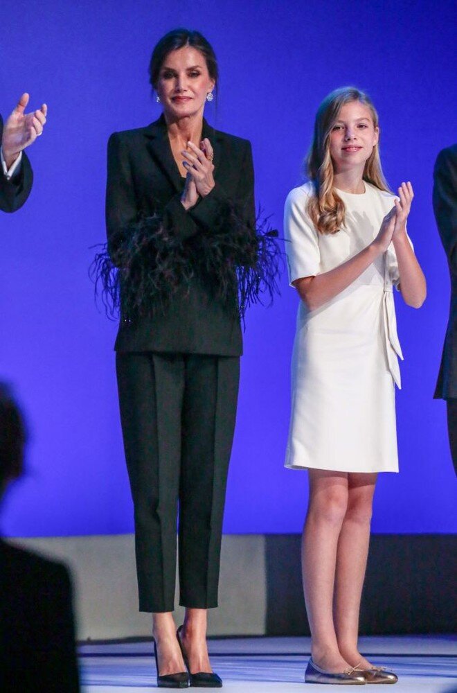 Уже на второй свой официальный выход в этом месяце королева Летиция надевает брючный костюм. Для торжественного мероприятия во Дворце конгрессов в Барселоне, звездой которого стала её старшая дочь принцесса Леонор, королева выбрала чёрный смокинг бренда Pertegaz. Но не смотря на цвет, она очень выделялась, благодаря необычному дизайну рукавов.