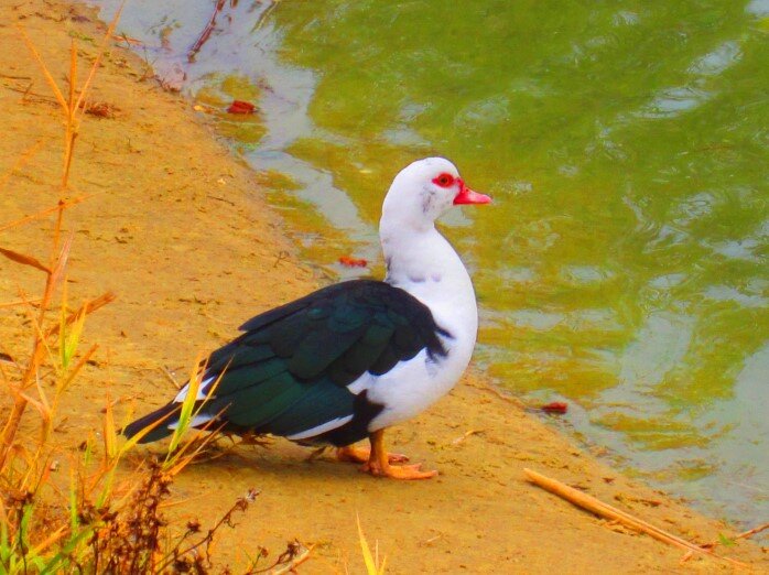 Однажды, гуляя по берегу пруда, я встретила на берегу вот это милое водоплавающее создание. Я не знаю, кто это. Я не разбираюсь в породах уток и гусей. Встреченная мной утка похожа на породу мускусных уток. Иначе их называют ещё индоутками. Но это прирученные домашние утки. А эта уточка в полном одиночестве находилась на противоположном от домов частного сектора берегу пруда. Кто знает, что это за порода водоплавающих, напишите мне в комментариях. Буду благодарна вам.