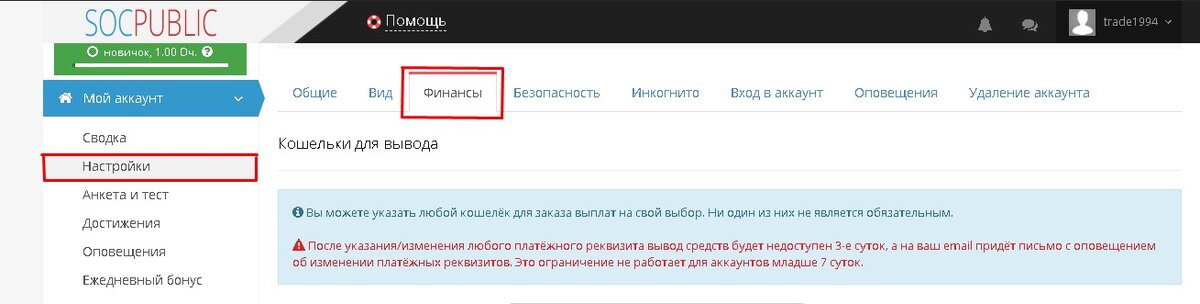 Всем привет в этой статье я вам дам сайт на котором есть возможность заработать без вложений собственных средств, да на нем нет возможности заработать миллионы, но на оплату телефона и интернета да и сводить девушку в кино возможно. Сайт называется соцпаблик это такой букс и на нем мы с вами будем зарабатывать вот ссылка на сайт https://clck.ru/JoZqL. Для начала заработка на этом сайте вам надо сначала пройти регистрацию это все в вас займет примерно 2-3 минуты, просто нужно указать логин, почту и пароль. После подтвердить свою почту просто перейти по ссылке которую отправит вам сам проект вот и все регистрация окончина можно приступать к заработку денег. И так на чем мы с вами будем зарабатывать, а зарабатывать мы с вами будем на серфинге, письмах, тестах, заданиях и посещениях. Но для начала нужно перейти в настройки после нажать финансы и указать свои кошельки для вывода денег. И так как же нам заработать для начала нужно войти в акаунт после надо нажать кнопку зарабатывать. посл