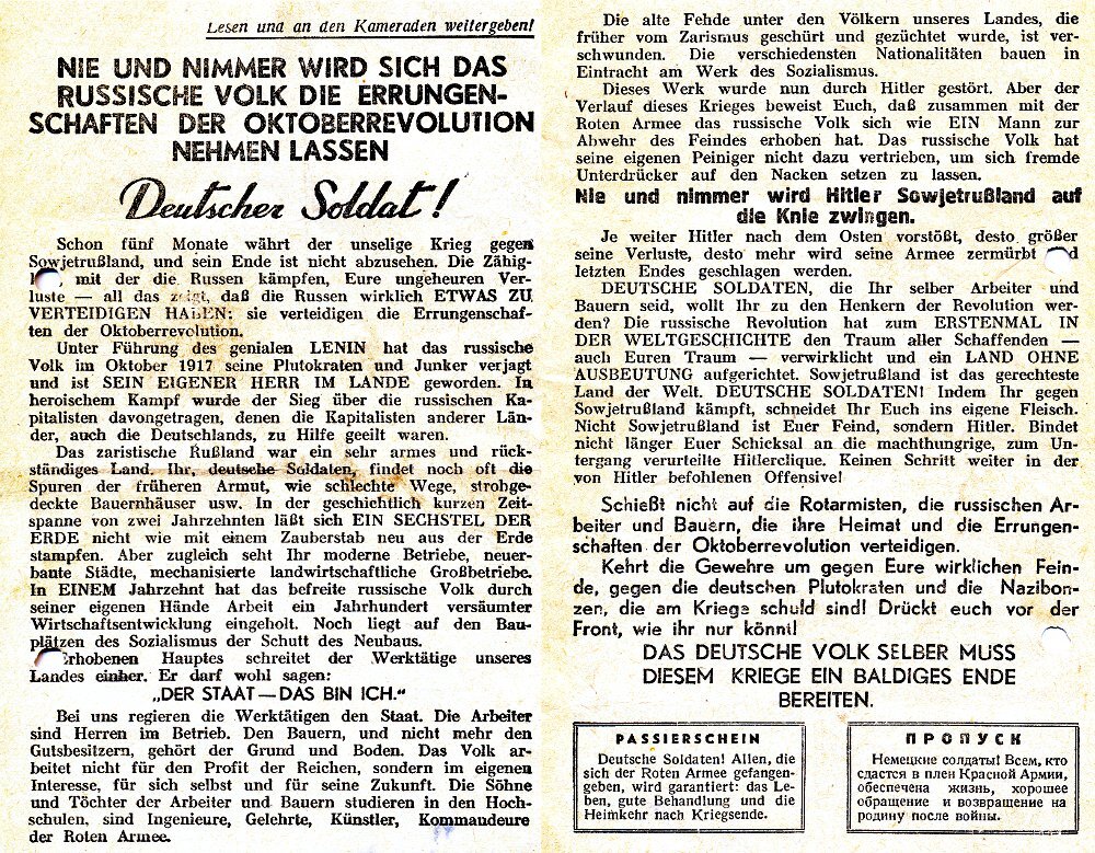 Всем привет! Предлагаю Вашему вниманию советскую листовку солдатам вермахта и её перевод. Прочти и передай товарищу РУССКИЙ НАРОД НЕ ПОЗВОЛИТ НИКОГДА В ЖИЗНИ ОТНЯТЬ ДОСТИЖЕНИЯ ОКТЯБРЬСКОЙ РЕВОЛЮЦИИ Немецкий солдат! Неудачная война против Советской России длится уже пять месяцев, и конца её не видать. Упорство, с которым воюют русские, ваши огромные потери - всё это показывает, что русским действительно есть ЧТО ЗАЩИЩАТЬ: они защищают достижения Октябрьской революции. Под руководством гениального Ленина русский народ прогнал своих плутократов и помещиков в октябре 1917 года и сам стал СОБСТВЕННЫМ ХОЗЯИНОМ В СТРАНЕ. В героической борьбе была добыта победа над русскими капиталистами, на помощь которым спешили капиталисты других стран, в том числе и Германии. Царская Россия была очень бедной и отсталой страной. Вы, немецкие солдаты, всё ещё часто находите следы былой бедности, такие, как плохие дороги, покрытые соломой избы и т. д. За исторически короткий промежуток времени в два десяти