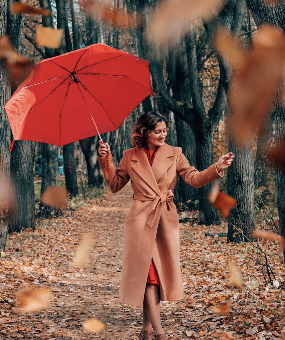 Одна из таких универсальных вещей на осень, это базовое пальто цвета camel. Оно прекрасно сочетается с яркими листьями и обрамляется яркими аксессуарами.