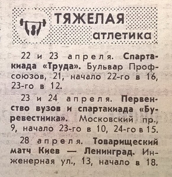 Впервые я понял это в 71 году, когда мой одноклубник Виктор Карамнов стал бронзовым призером чемпионата Ленинграда в отдельных упражнениях. В зале мы с волнением рассматривали медали с буквой "Л", примеряли их на себе и смотрелись в зеркало. Жалко, что не могли сделать селфи! :). В профкоме завода Виктор за свой успех получил 50 рублей! В нашем коллективе он был первопроходцем - первым мастером спорта и первым призером крупного и престижного турнира - Чемпионата Ленинграда! Календарь и результаты Чемпионата Ленинграда оповещали такие крупные издания, как "Ленинградская правда", "Вечерний Ленинград", "Смена" и "Спортивная Неделя Ленинграда". Чемпионов и призеров Ленинграда знали в каждом зале. Это сейчас мастер спорта уже звезда. Тогда в любом тяжелоатлетическом зале их было не один и не два. В 80-х у нас в поселковом спортзале было уже 6 выступающих мастеров спорта. А в Ленинграде в специализированных залах по 10 и более мастеров железной игры. Уровень тяжелоатлетов в городе на Неве б