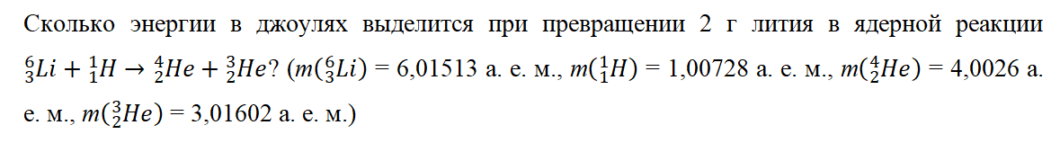 Полное условие задачи Краткое условие задачи Решение задачи Найдем число ядер, содержащихся в литии: Количество вещества определим через формулу: Тогда: При превращении одного ядра лития по приведенной ядерной реакции выделяется энергия: где: Получаем: Энергия, которая выделится при превращении всего лития найдется следующим образом: Подставляем данные и находим численный ответ: