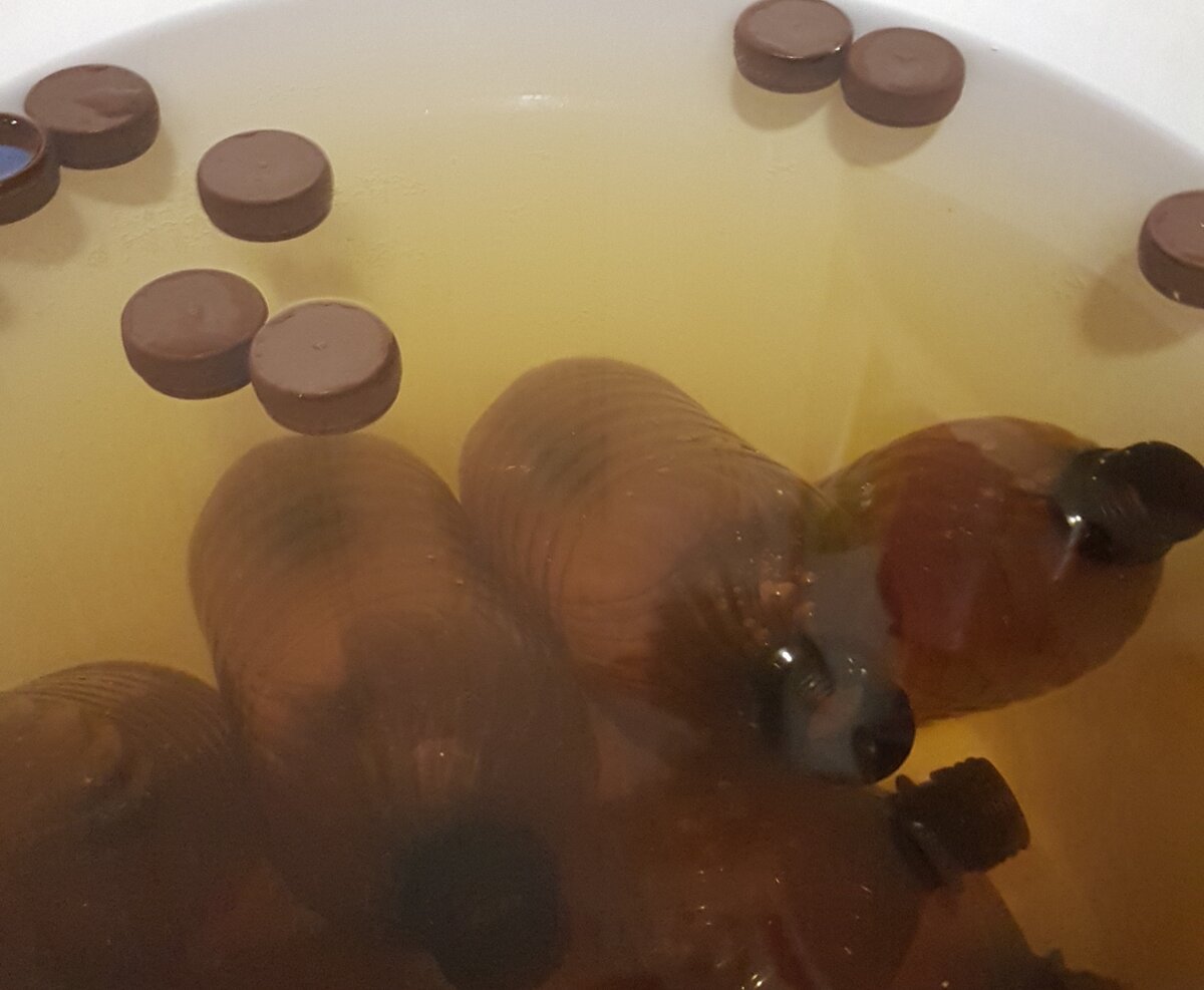 Дезинфекция бутылок Материалов о том, как дезинфицировать бутылки перед розливом, в интернете предостаточно. Перепробовав разные варианты для себя я в итоге пришел к оптимальному для меня решению: В пластиковый бак объемом 33 л (стандартный бак для брожения) наливаем прохладную (холодную) воду почти до верха, добавляем туда целый пузырек йода объемом 10 мл, размешиваем и погружаем полностью в воду 10 однолитровых ПЭТ бутылок (все влезают). Пробки отправляем купаться туда же отдельно. Минут через 10 бутылки достаем, сливаем из них раствор обратно в бак и можем разливать в них пиво, а в бак погружаем новую десятку бутылок. Учитывая слабость раствора йода для воздействия на пиво и организм, ополаскиванием бутылок после дезинфекции я не заморачиваюсь – в интернете сообщество дезинфекторов давно разобралось в безопасности такого способа. Дезинфекция остального Стоит ли заморачиваться с дезинфекцией самой пивоварни, бродильных баков? Перед первым использованием и после длительного пе