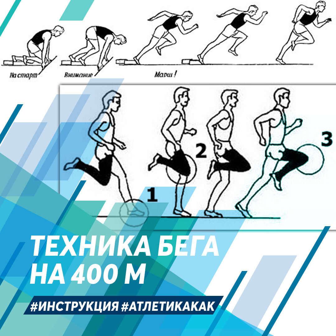 #Инструкция #АтлетикаКак 400 м #ТехникаБега на 400 В отличие от других спринтерских дистанций бег на 400 м называют спринтерским марафоном. Эта дистанция требует от спортсмена спринтерских качеств, отличающихся от других спринтерских дистанций, – скоростной выносливости и умения оптимально распределить на дистанции силы. Эти специфические качества не позволяют большинству спортсменов сочетать 400-метровую дистанцию с другими. Техника бега на 400 м. включает следующие этапы: ✅ Низкий старт с установкой колодок у внешней бровки дорожки по касательной к ее дуге, что позволяет стартовые 10 м пробежать по прямой. После команды на старте «внимание» легкоатлет должен подготовиться к свободе движений в стартовом разбеге. ✅ Стартовый разбег осуществляется на 30-40-метровом поворотном участке дорожки, поэтому все части тела должны участвовать в нейтрализации центробежной силы: ступни несколько поворачиваются влево, левая рука приближается к туловищу, а правая направляется внутрь, плечо и ту