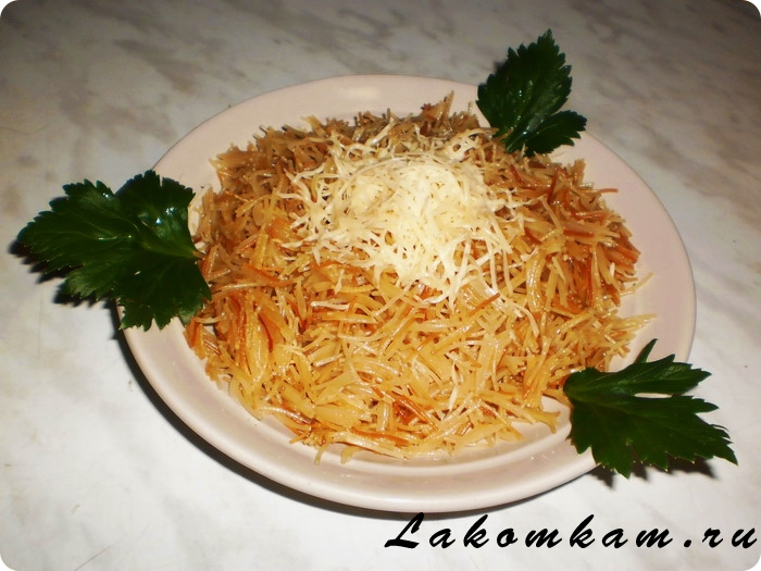 Горячий гарнир посыпаем тёртым на тёрке сыром и подаём на стол.