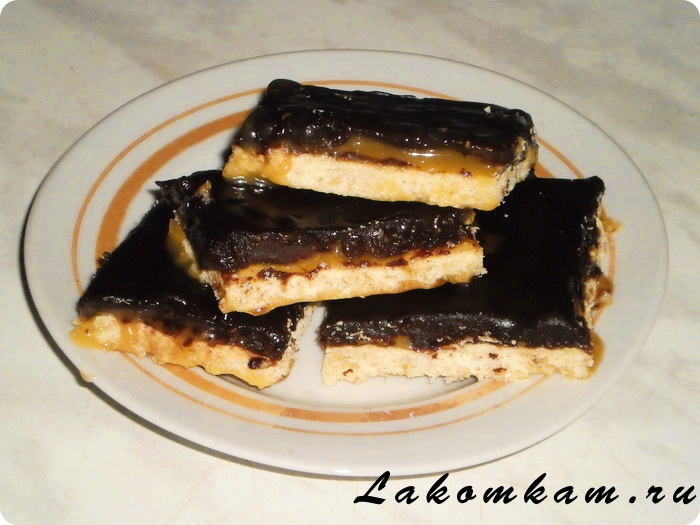 Ингредиенты: пшеничная мука — 150 грамм; сливочное масло — 80 грамм; сахар — 50 грамм; яичные желтки — 1-2 штуки; сметана — 1-2 столовые ложки; соль — на кончике ножа. Для карамели: сгущенное молоко — 1-1,5 банки; сливочное масло — 15 грамм. Для шоколадного слоя: молочный шоколад — 200-250 грамм.