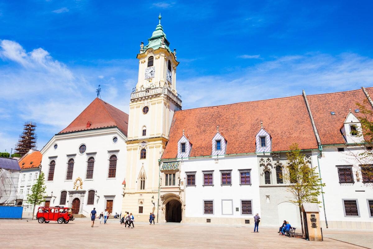 Старая Ратуша (Stará radnica) Одним из древнейших сооружений в городе является Старая ратуша. Она представляет собой композицию из нескольких зданий. Первая постройка появилась в начале XIV столетия, постепенно появились и другие, к концу XV века строительство было завершено. Первоначально все здания были выполнены в готическом стиле, однако из-за землетрясений в XVI, а также после пожаров XVIII века, сооружения перестраивались, обретая детали в стиле неоготики и неоренессанса. С начала XV столетия на территории ратуши проходили городские собрания. В различные периоды она использовалась как тюрьма, монетный двор. В настоящий момент здесь работает городской музей. Древнейшей частью комплекса является часовая башня. На уровне второго окна со стороны фасада можно увидеть застрявшее пушечное ядро, снаряд напоминает о тяжелых временах, когда на город напали Французы под предводительством Наполеона Бонапарта. Часовая башня одна из высоких сооружений Братиславы, на ее верхней точке расположен