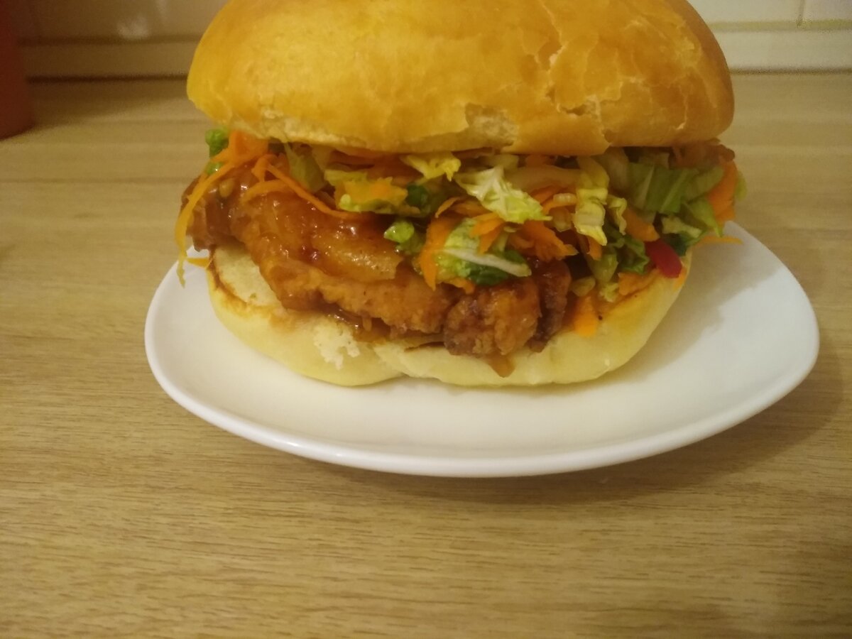 Сэндвич с хрустящей курицей, китайским салатом и китайской горчицей. На 3 сэндвича 3 гавайские булочки 450 гр. филе куриного бедра кунжут Маринад 150 гр. соуса хойсин 70 мл. рисового уксуса 3 ст.л. соевого соуса 3 ст.л. сахара 1 ст.л. кукурузного крахмала Кляр 60 мл. пахты 1 яйцо 50 гр. кукурузного крахмала 50 гр. муки 0,3 ст.л. разрыхлителя Соус генерала Цо 2 ст.л. свежего имбиря 3 шт. сушенного сычуаньского перца 2 зубчика чеснока маринад 200 мл. воды Китайский салат 5 перьев зеленого лука 1 крупная морковь 1 большой кочана пекинской капусты 1 шт. средне-острого перца 55 мл. рисового уксуса 2 ст.л. соевого соуса 1 ст.л. сахара 1 ч.л. кунжутного масла Китайская горчица 25 гр. сухой горчицы 50 мл. кипятка 50 гр. майонеза 1 зубчик чеснока соль черный перец Начнем с китайской горчицы. Горчицу заливаем кипятком и полностью остужаем. Лишнюю воду надо будет слить. Смешиваем с майонезом, натертым чесноком, солью и перцем. Убираем в холодильник. Теперь курица и маринад. Смешиваем все ингреди