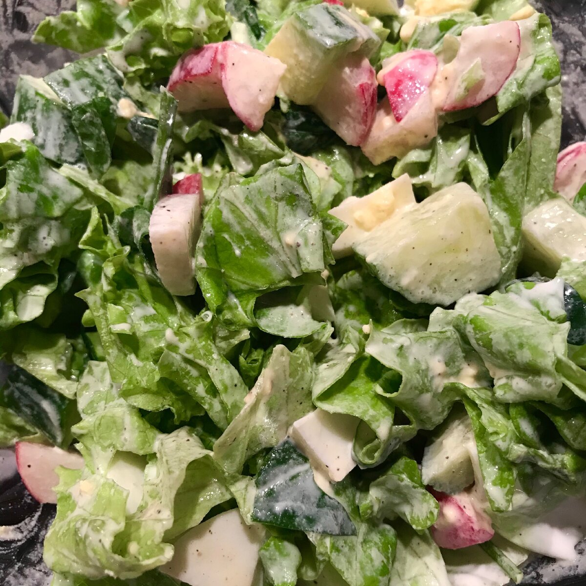 Всем привет! Рекомендация ведущих диетологов - 5 порций свежих овощей и фруктов в день. Частенько готовлю вот такой салат. Для мужчин это дополнение к ужину, а для меня прям полноценный приём пищи. Готовится легко и быстро. Для салата понадобятся: 1 варёное яйцо 1 свежий огурец 5 редисок заправка листья салата (у меня был мелкий шпинат и обычный «в горшочке» который). Все помыть-нарезать, добавить чёрный перец, соль и заправку. Я для заправки использовала обычную 15% сметану, но вкусно будет и с йогуртом например. Вкус получается мягкий, яйцо нейтрализует терпкость редиски, при этом приятные нотки свежих овощей. Предложила этот салат сегодня мужу, который не любитель как он выражается «всей этой травы», так пришлось себе готовить заново, все скушал. Кстати листья салата рекомендуют рвать руками. Но я режу, потому что его люблю есть мелкими кусочками. Приятного аппетита!