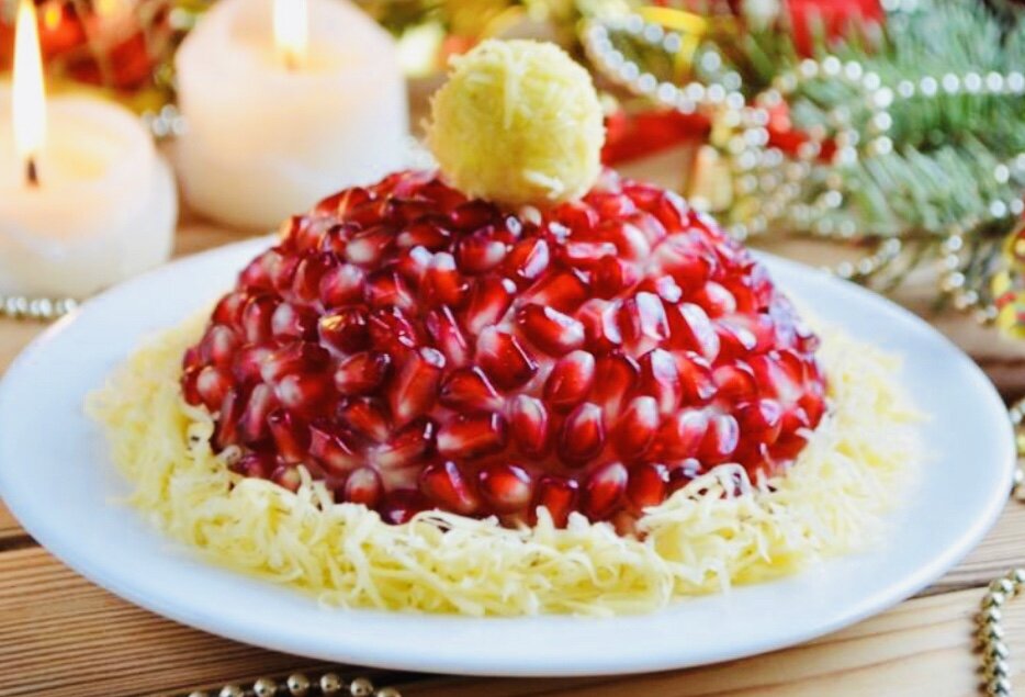 Здравствуйте, дорогие читатели! Сегодня хочу предложить вам вкусный и нарядный салат. Он эффектно смотрится на праздничном столе. Сочетание курицы, орехов, сыра и граната порадует гурманов. Нам понадобится Приготовление Подготовьте продукты для салата. Отварите куриное филе, яйца, овощи. Все остудите и очистите. Очистите также гранат и грецкие орехи. Картофель порежьте небольшими кубиками и сложите в салатник. Порежьте морковь кубиками, добавьте её к картофелю. Порежьте лук мелко, ошпарьте его кипятком, чтобы потерял горечь, и отцедите от жидкости. Добавьте к овощам в салатник. Порежьте яйца кубиками. Один желток оставьте для "бубончика" на шапочку. Курицу порежьте кубиками, добавьте её к остальным ингредиентам. Острым ножом порежьте мелко орехи, не стоит использовать блендер, будет слишком мелкая крошка. Добавьте в салат орешки, майонез, соль и перец черный молотый. Перемешайте. Основа для шапочки готова. Возьмите глубокую салатницу, застелите сначала пищевой пленкой, у