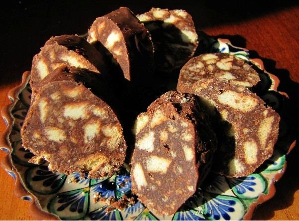 1. Крошим печенье на маленькие кусочки в большое глубокое блюдо. Я не парилась сильно - печеньки были в полиэтиленовой упаковке, так что просто как следует постучала ей об стол - вот и крошка готова :)