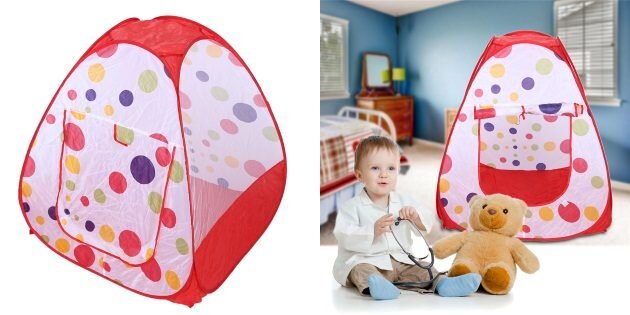 А есть палатки, совмещённые трубой с бассейном для шаров. Такая модель понравится подвижным детям.