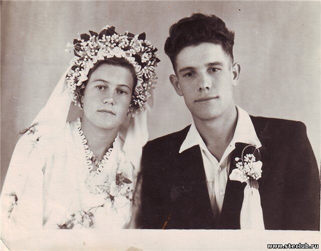 Собирая информацию на тему свадьбы, часто нахожу разные интересные фотографии. Особенно мне нравятся старые черно-белые фото. Свадебные наряды и головные уборы невест на этих фото сильно отличаются от современных. Раньше в основном все свадебные атрибуты изготовлялись кустарно. Платья шились либо самими невестами, либо местными портнихами. Венки в 50-60 годах делали из воска. Это были либо просто шарики, закрепленные на проволоке, либо цветы флердоранжа из воска. Конструкция обматывалась тюлем, добавлялись листики из бумаги, ленты - и получался нарядный свадебный венец. Его обычно хранили всю жизнь за иконами, а иногда укладывали прямо на икону. Но не только наряды меня интересуют на фото. Обращаю внимание на выражение лиц молодоженов. Почему-то кажется, что сейчас уже нет таких лиц, такой правды жизни. Все как-то отгламурено, а значит недостоверно, напоказ. А в этих фотографиях чувствуется искренность, неподдельность. Этого нам не хватает, как мне кажется. Предлагаю просто посмот
