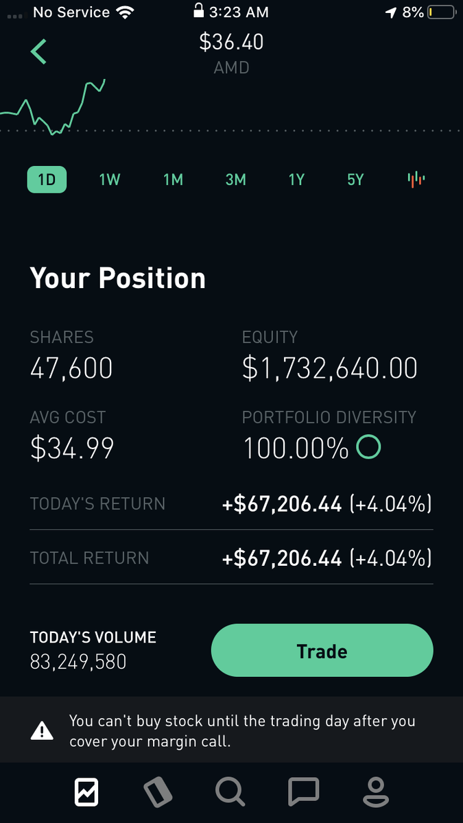 В начале этой недели в торговом приложении от компании Robinhood произошел технический сбой и трейдеры показывали в Интернете неограниченные возможности займа денег, которые позволяла программа. Даже после того, как история попала в цикл финансовых новостей, и представители Robinhood выступили с заявлением, в котором сказали, что "осведомлены об отдельных ситуациях", трейдеры продолжали размещать скриншоты своих вновь обретенных торговых возможностей. Например, трейдер " Call Warrior " поделился своей историей во вторник вечером. "После того, как я понял, что у меня осталось всего несколько тысяч долларов на торговлю, я решил, почему бы не попробовать этот новый "глюк", - написал он. Так, по его словам, он заработал на акциях AMD более $1.7 млн. "Я использовал более 500-кратное кредитное плечо, что является отличным аргументом против моих друзей, торгующих на рынке Форекс", - объяснил он. Вот снимки его счета: Так как это вообще возможно? Пользователям премиум-уровня платформы, был