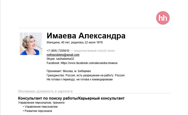 - Контакты. Номер телефона (по которому вы оперативно доступны), электронная почта, которую вы ежедневно просматриваете (смотрим на название ящика глазами работодателя, babayaga77@mail - не лучший вариант), мессенджеры (где вас оперативно можно найти, ICQ - уже прошлый век!), ссылки на соцсети (проверяем контент), если вы ищете работу конфиденциально - профили в соцсетях должны быть заполнены максимально подробно!!!