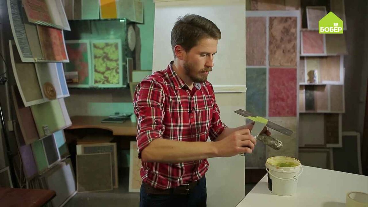 Приступите к нанесению декоративной штукатурки: положите небольшое количество штукатурки на кельму и начните наносить её на стену снизу вверх.
