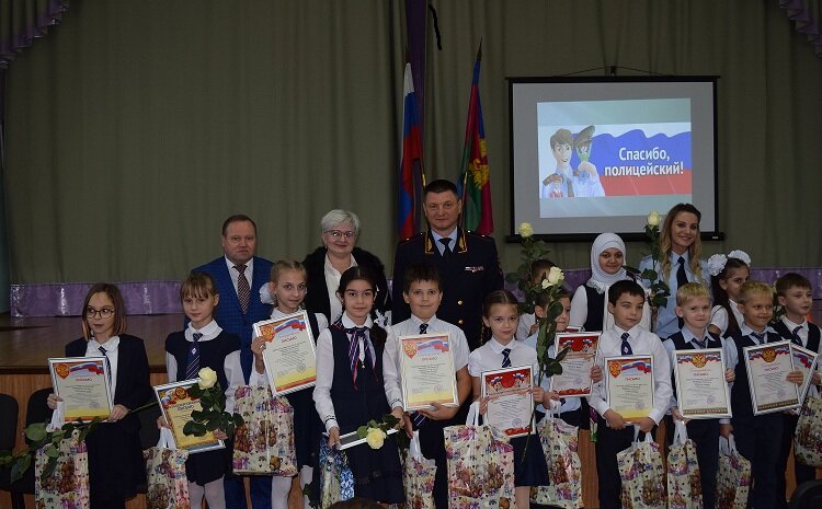 В Сочи полицейские подвели итоги конкурса рисунков и поделок «Спасибо, полицейский!». В СОШ № 24 Центрального района прошла церемония награждения. В честь празднования Дня сотрудника органов внутренних дел в Сочи прошел конкурс рисунков и поделок «Спасибо, полицейский!». Участниками стали ученики 2-х, 3-х и 4-х классов СОШ № 24. Все работы выставлены теперь в фойе УВД по городу Сочи. Все представленные на конкурс работы оценивало жюри, в состав которого вошли руководители различных подразделений УВД по городу Сочи, члены Общественного совета при УВД, представители Совета Ветеранов УВД по городу Сочи. Возглавил жюри заместитель начальника ГУ МВД России по Краснодарскому краю – начальник УВД по городу Сочи Сергей Огурцов. В своих рисунках дети изобразили сотрудников подразделений по делам несовершеннолетних, инспекторов безопасности дорожного движения и участковых уполномоченных полиции, сотрудников кинологической службы. Среди самых популярных сюжетов – портреты полицейских и задержан