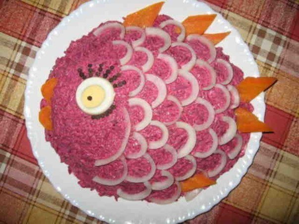 Украсить салат можно, сделав из половинок репчатого лука чешую, из яичного белка - глазик, а из вареной моркови - плавники и хвост. Готовый салат ставим в холодильник, чтобы он настоялся хотя бы пару часов.